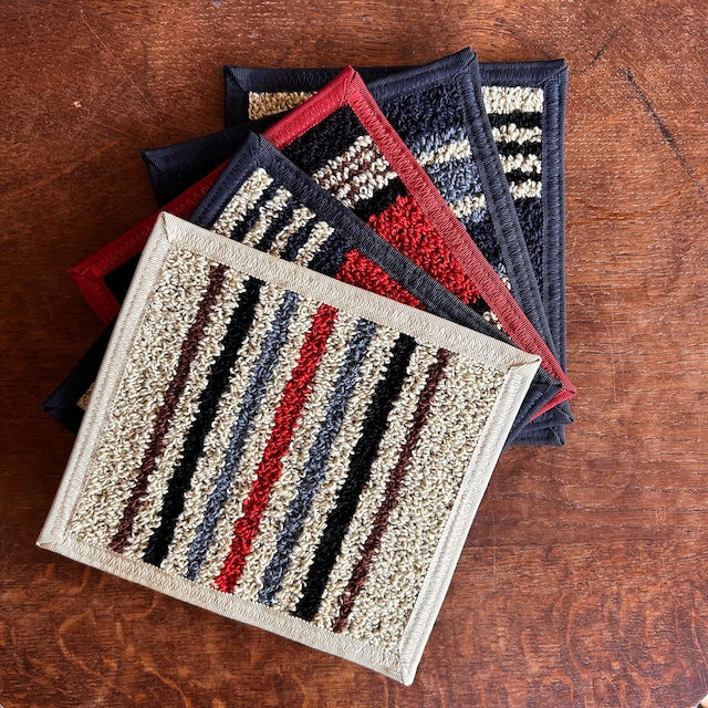芹沢銈介デザインの倉敷緞通です(岡山県倉敷市)。 倉敷緞通は以前より、金波織と呼ばれ作られていました。柳宗悦たちの目にとまり、芹沢銈介にデザインを依頼し「倉敷緞通」が出来ました。 作り手は瀧山雄一さんで、岡山県倉敷市内にてお一人で制作されています。 表面はレーヨンの混合糸でリング状に紡いだ糸が使われています。裏面は紙がまかれた井草で、通気性があってさらりとした手触りです。玄関やお部屋の棚に花瓶やカレンダーの敷物としてご利用になってはいかがでしょうか。 〈サイズ〉 花瓶敷 約17×18㎝ デザインは5種、No.を選択してください。