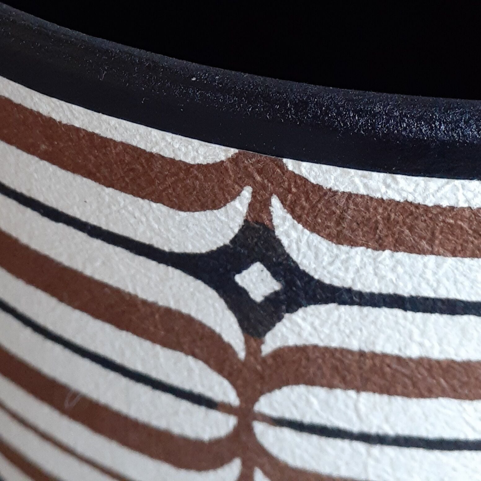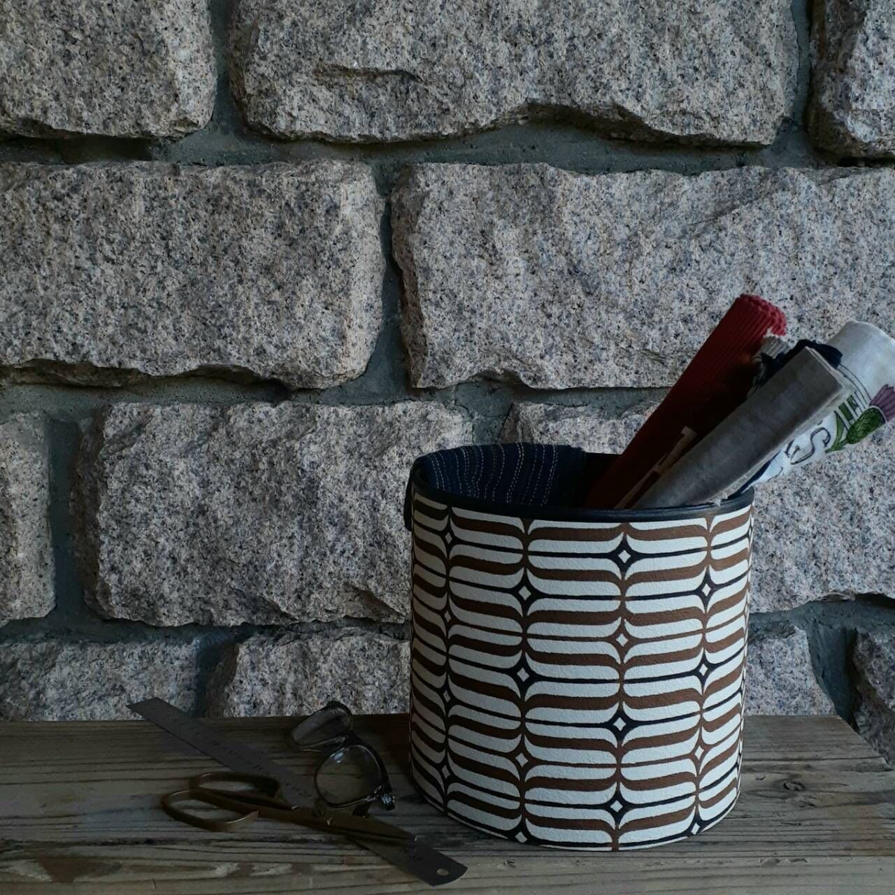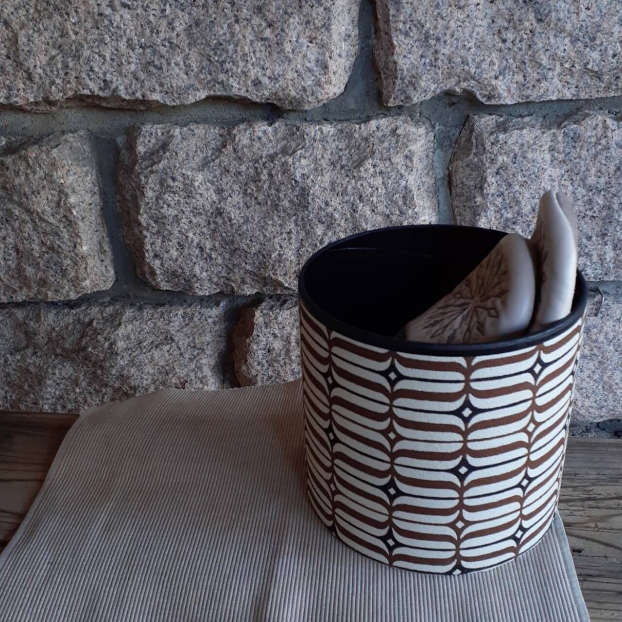 芹沢銈介美術館museumshopオリジナル・茶色のアイヌ柄の小物入れです。部屋の小物をまとめたり、スリッパ入れとしても。置くだけでインテリアのアクセントになります。紙の筒でできているので入れるときに大きな音がせず、とても使いやすいです。