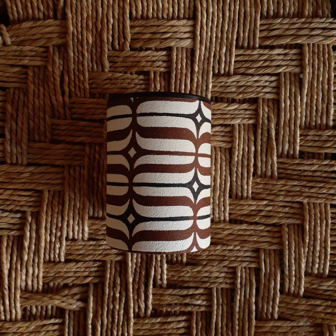 芹沢銈介美術館museumshopオリジナル・茶色のアイヌ柄のペン立てです。筆記用具以外にも、眼鏡やリモコン入れとしてもお使いいただけます。紙の筒でできているので入れるときに大きな音がせず、とても使いやすいです。