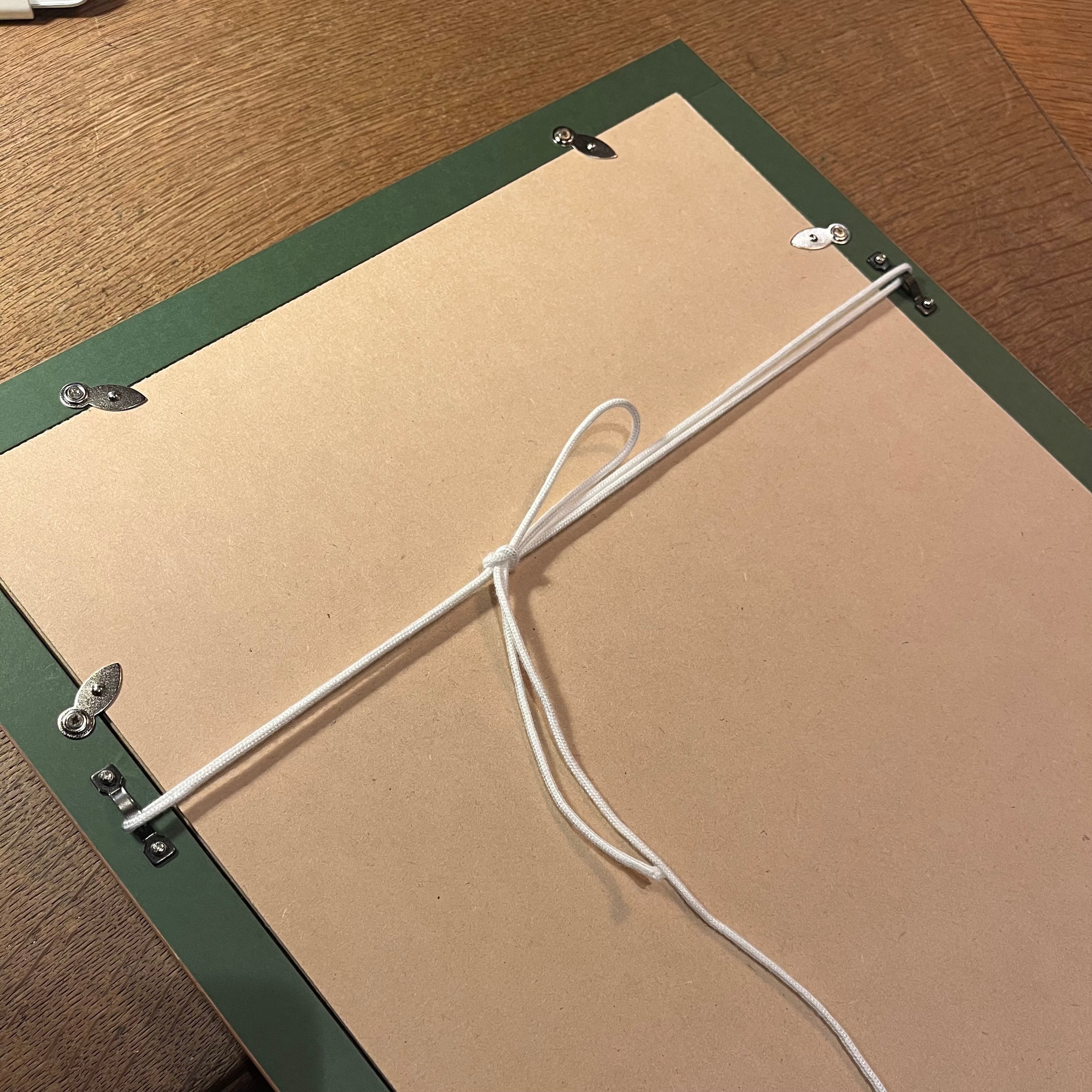 表面はアクリル板で、額の裏側には壁に掛けられるよう金具と紐がついています。