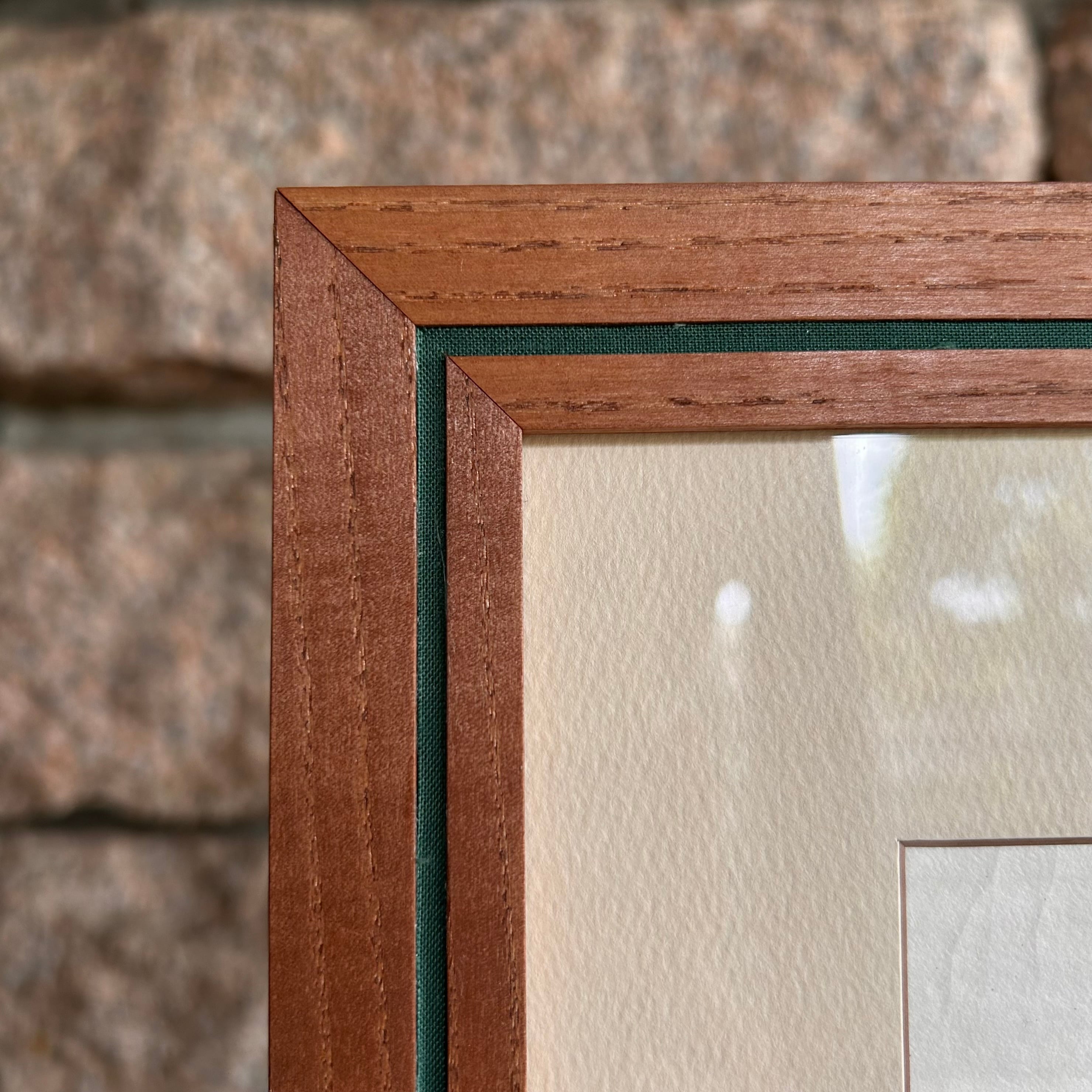枠に溝をついて、茶色の額はグリーン、ベージュの額にはピンク色の布を張っています。