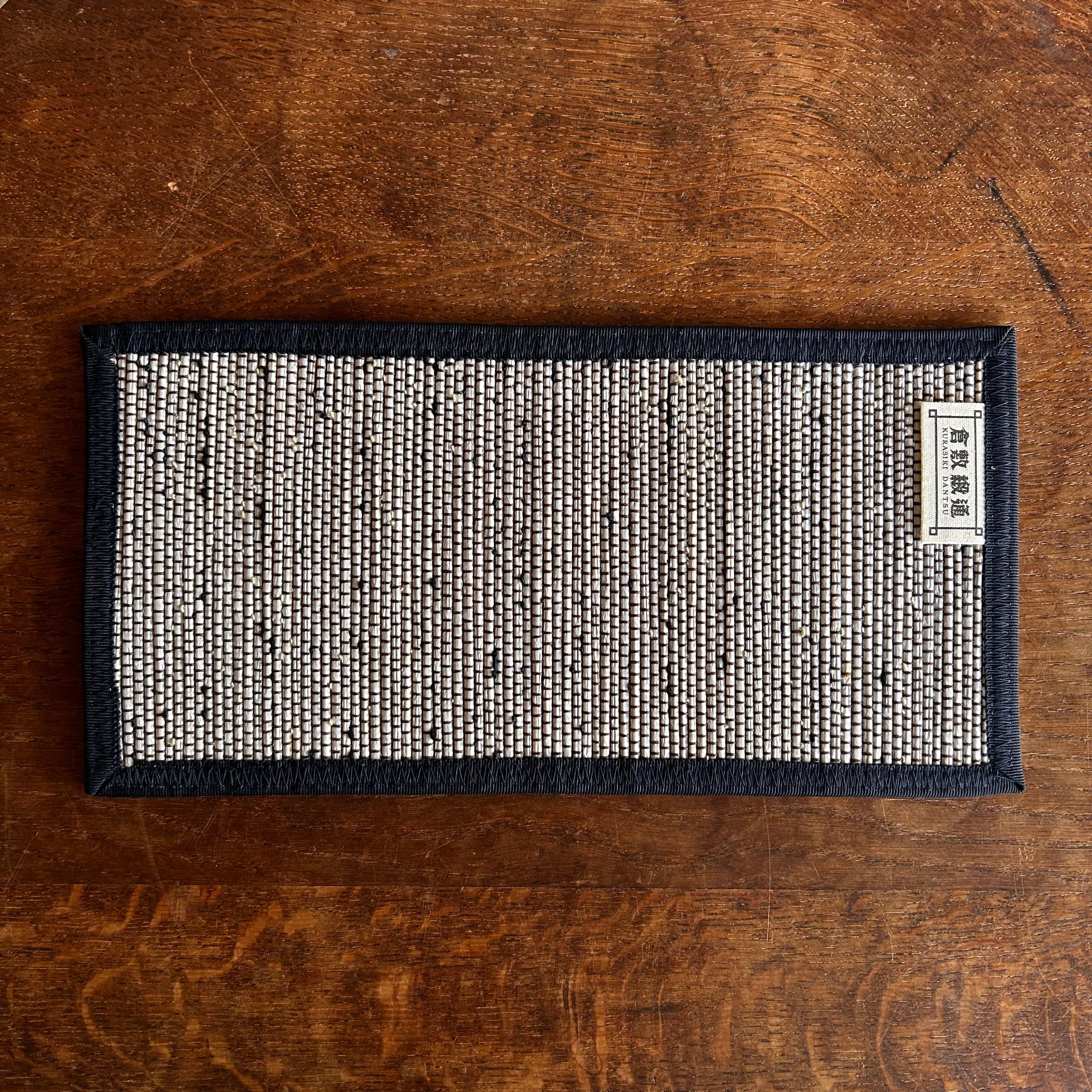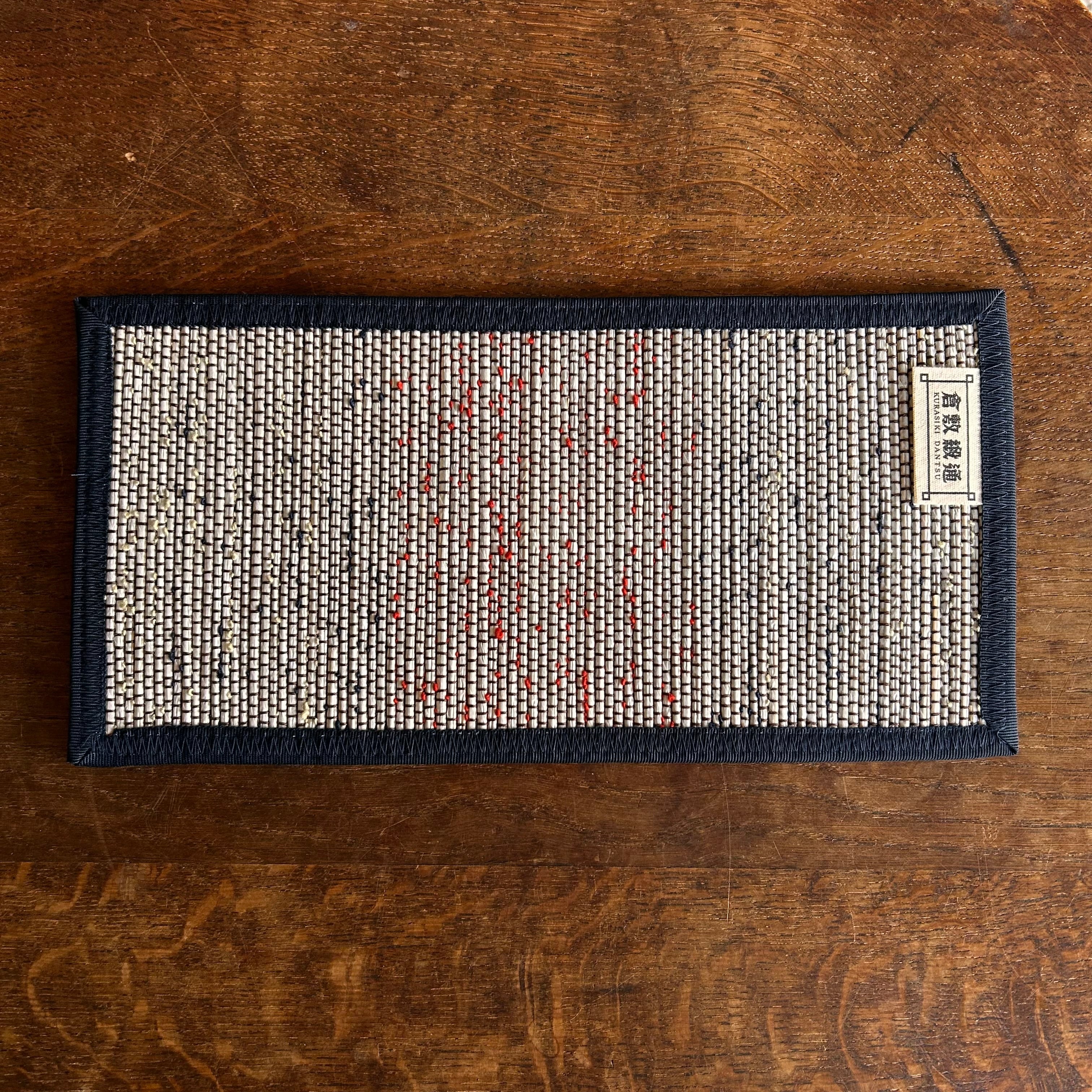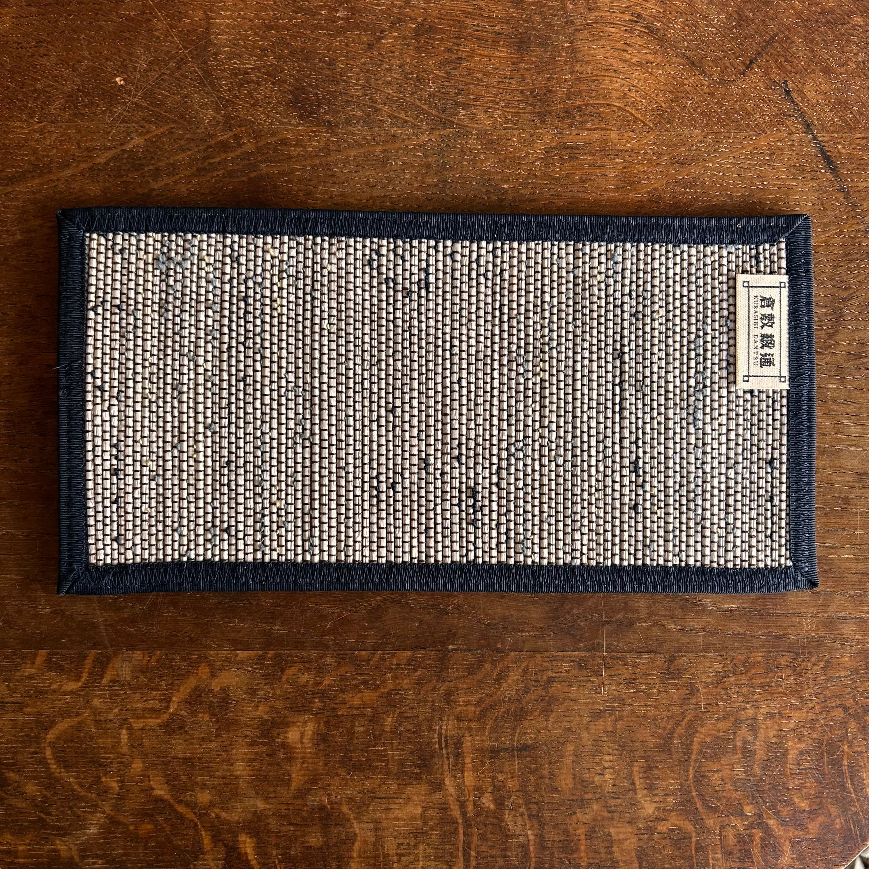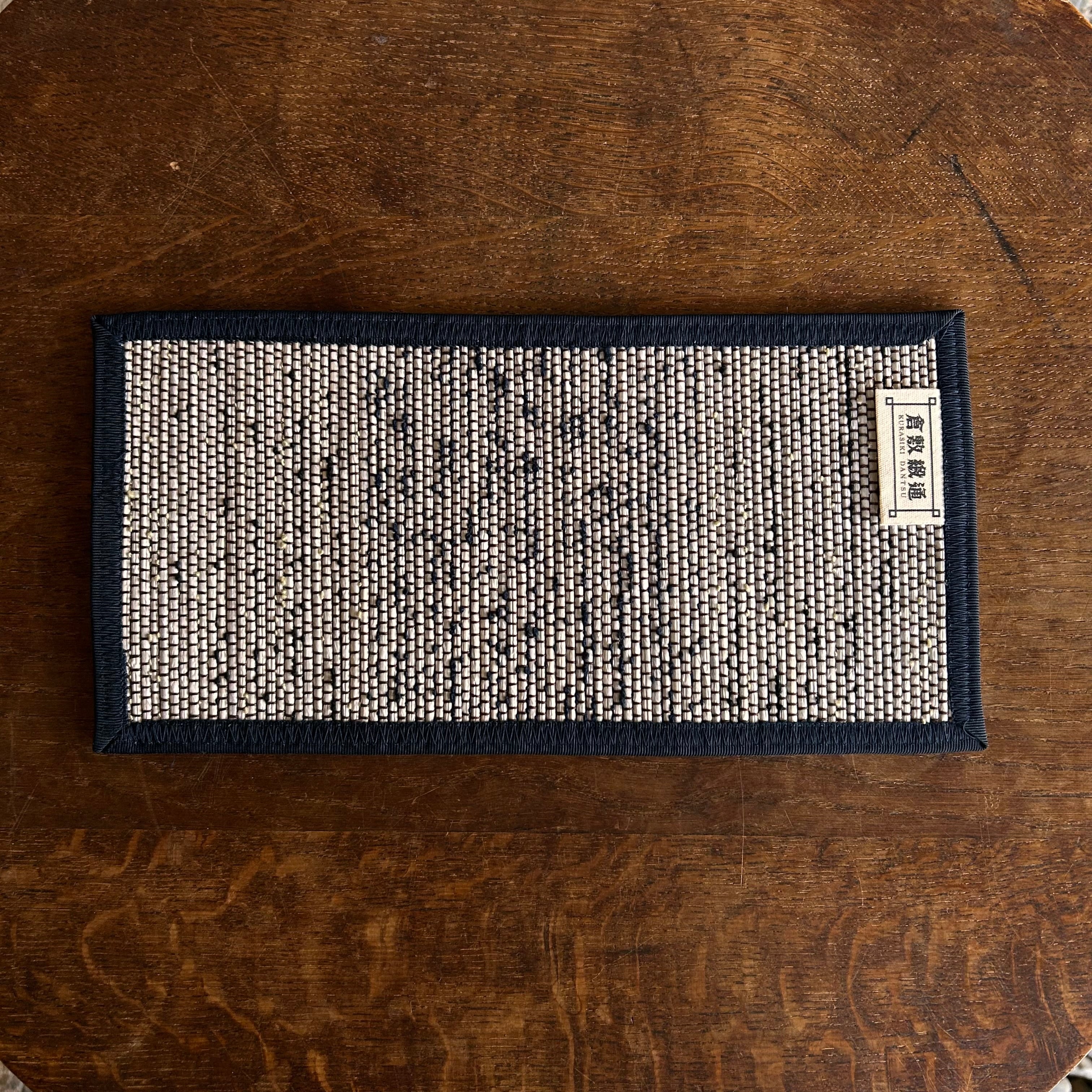 表面はレーヨンの混合糸でリング状に紡いだ糸が使われています。裏面は紙がまかれた井草で、通気性があってさらりとした手触りです。玄関やお部屋の棚に花瓶やカレンダーの敷物としてご利用になってはいかがでしょうか。