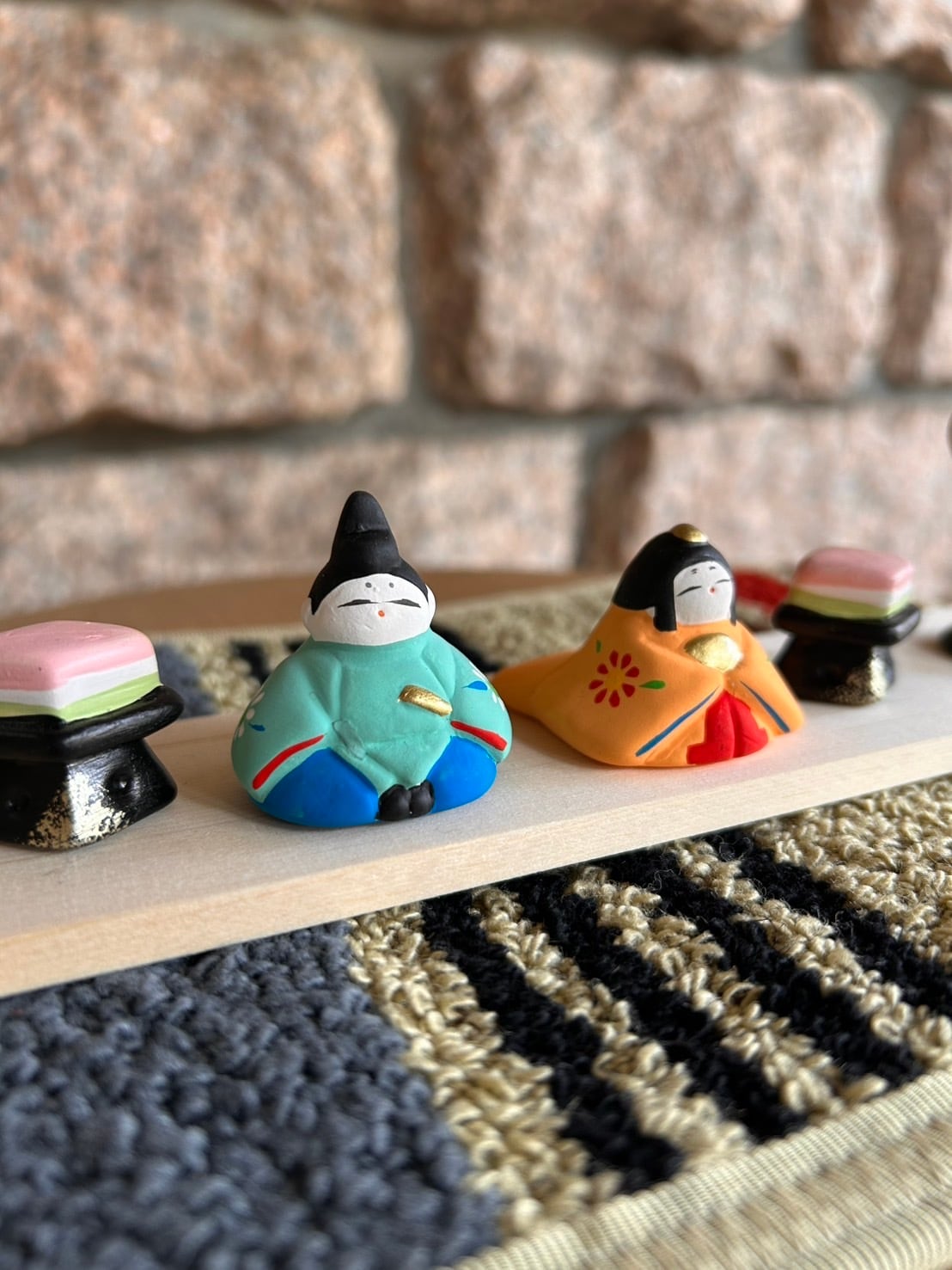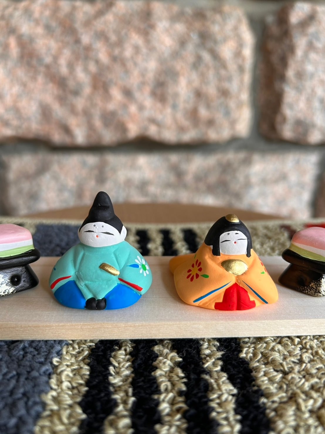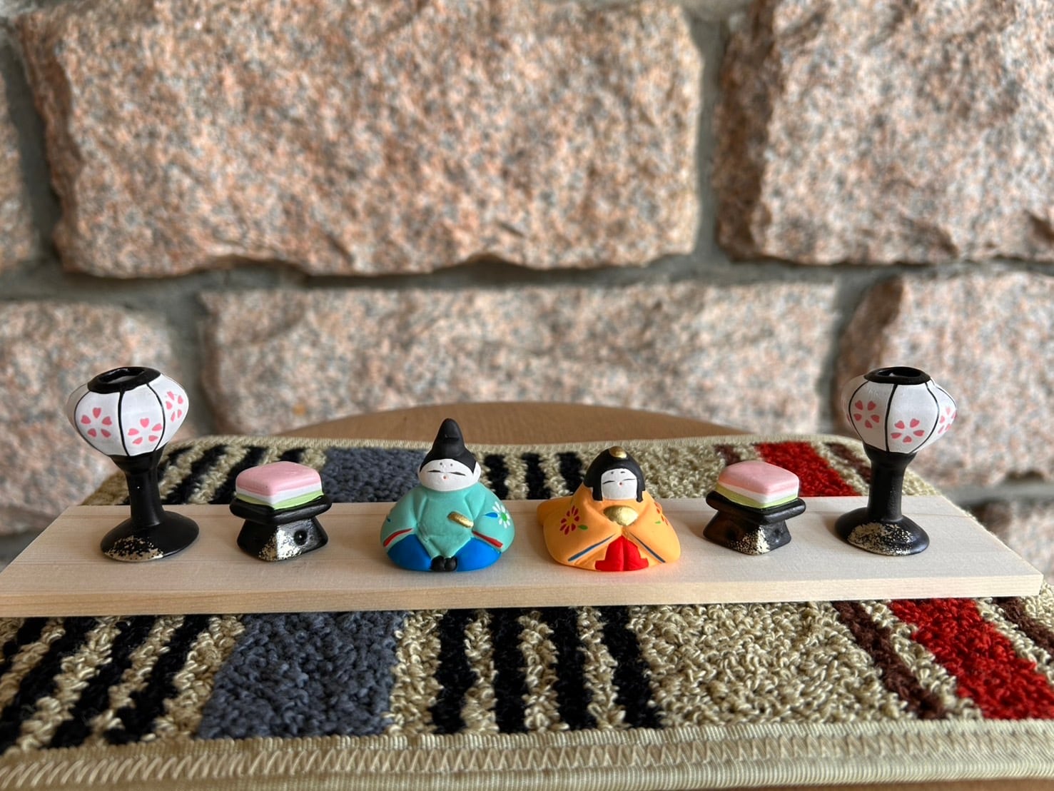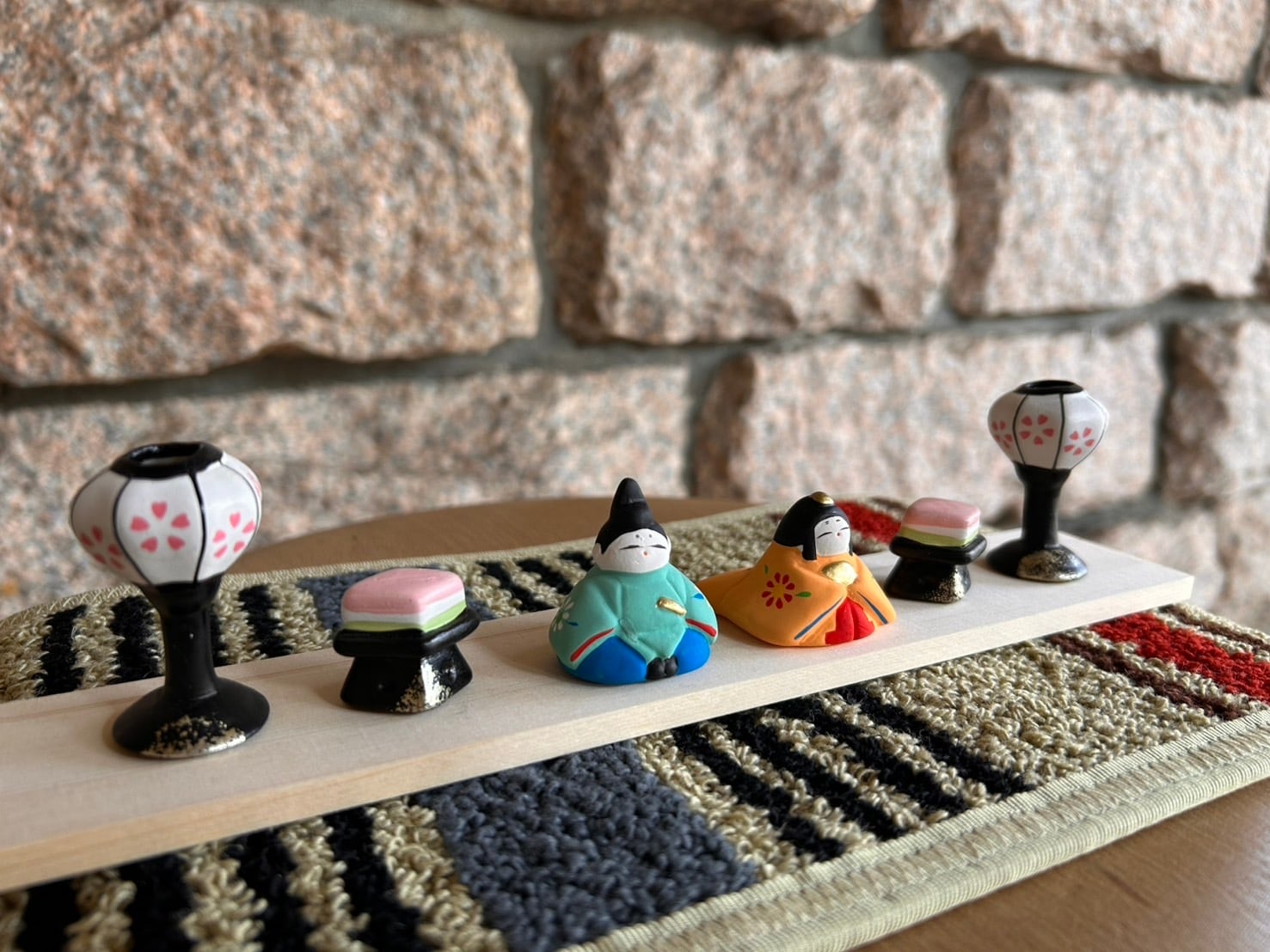 男雛、女雛、菱餅、ぼんぼりと並んでいてミニチュアでかわいらしいです。