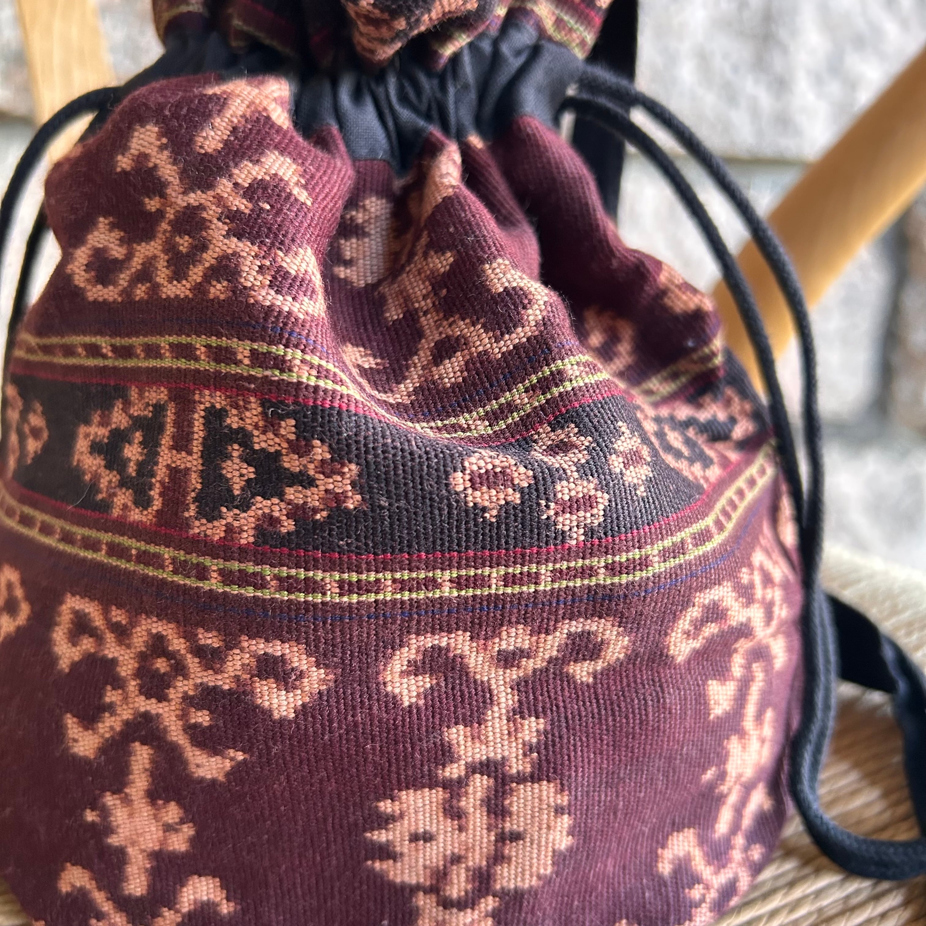 使用されている古布は経絣(たてがすり)の手織りの布で、 幾何学、縞、花の文様が組み合わされたデザインがシックでお洒落です。