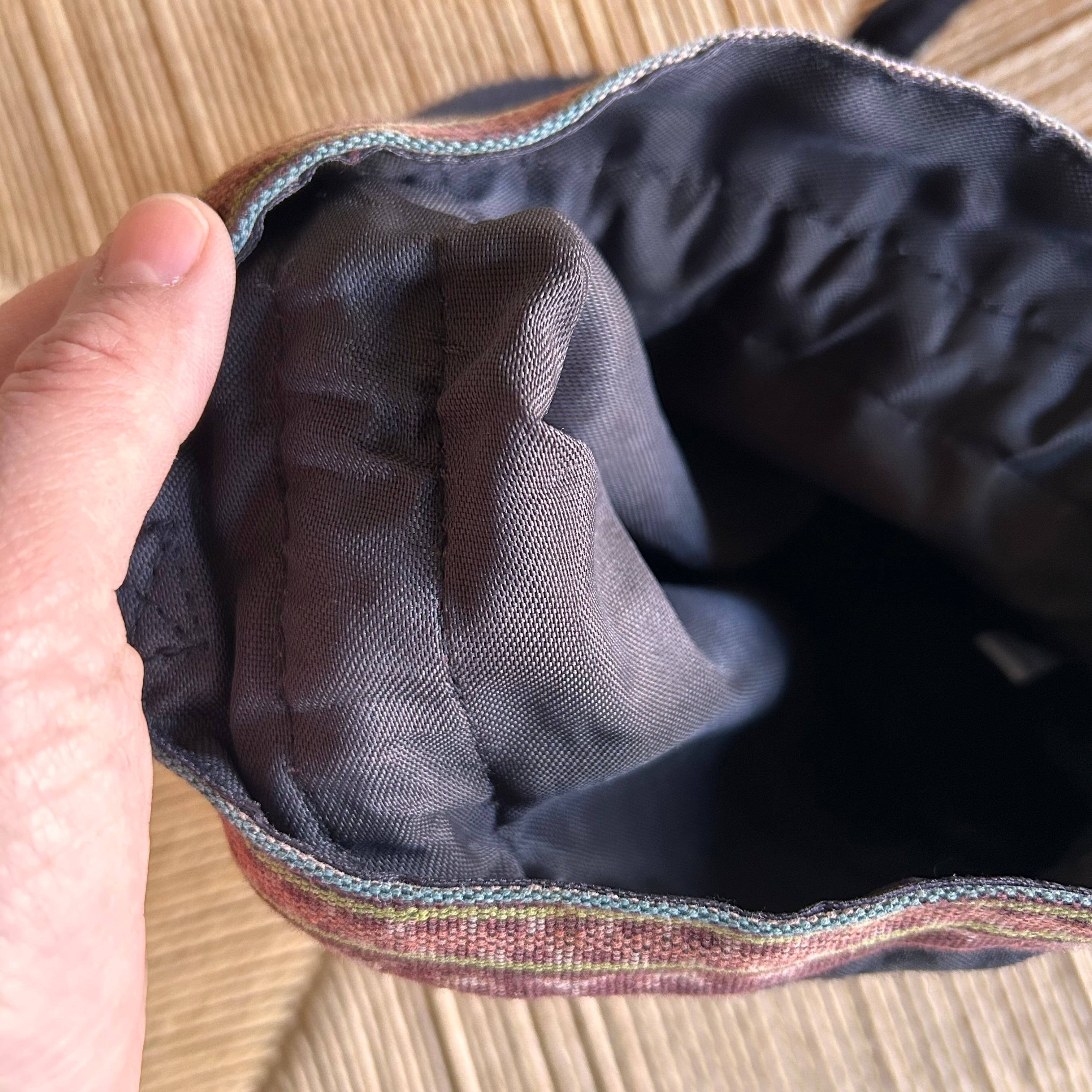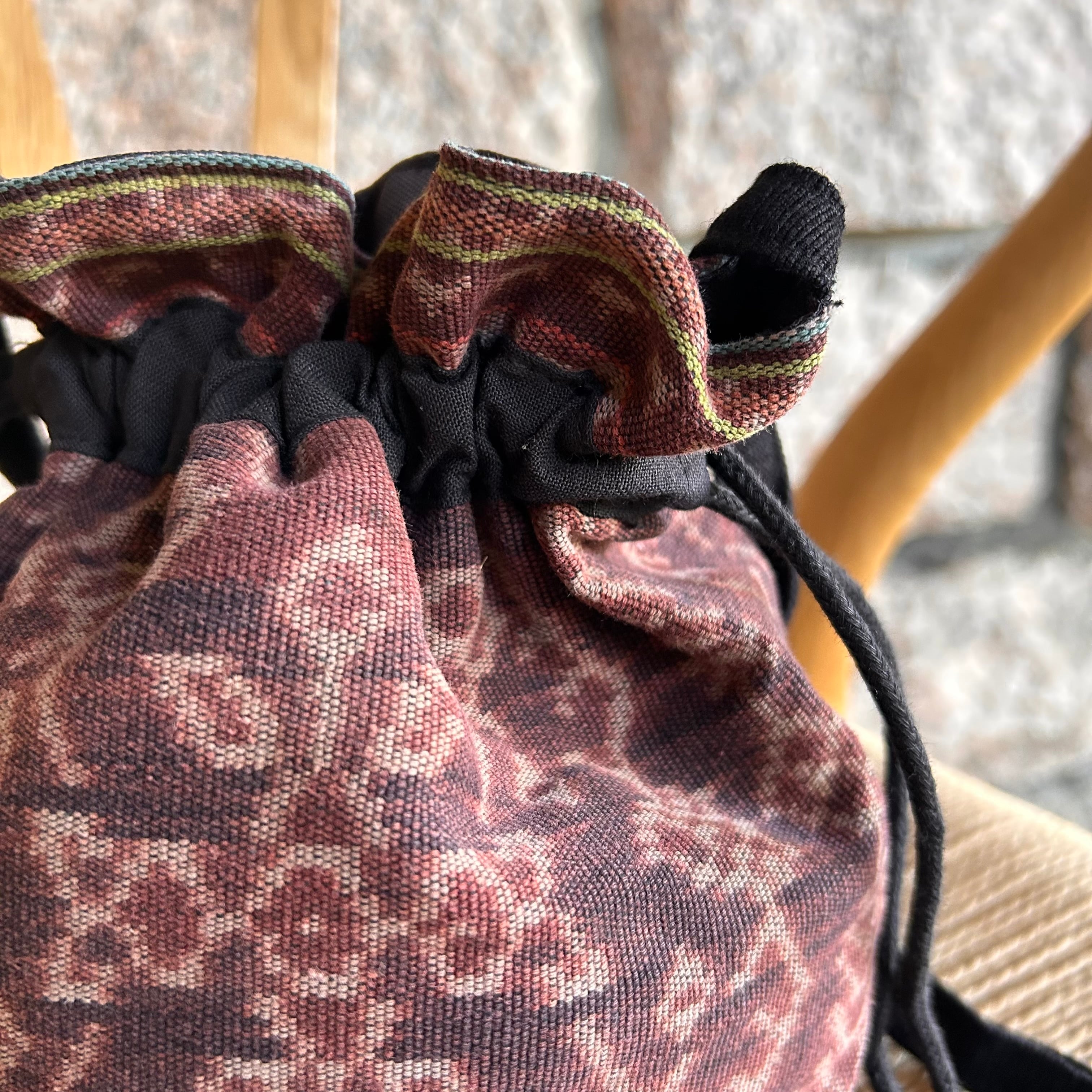 使用されている古布は経絣(たてがすり)の手織りの布で、 幾何学、縞、花の文様が組み合わされたデザインがシックでお洒落です。